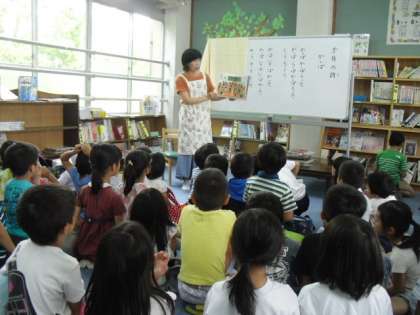 今月は谷川俊太郎さんの「かっぱ」の詩を教えていただき,子どもたちも声を合わせて読みました。リズムに乗って読んでいると子どもたちに笑顔が広がります。その後「たかこ」の絵本を読み聞かせしていただきました。本の世界に入り込んで,耳を傾ける子どもたちでした。