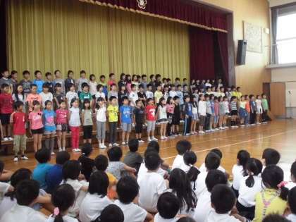 群読は,毎日教室で今月の詩を全校が読んでいるのですが,その詩を担当学年が,学年全員で声を合わせて表現します。