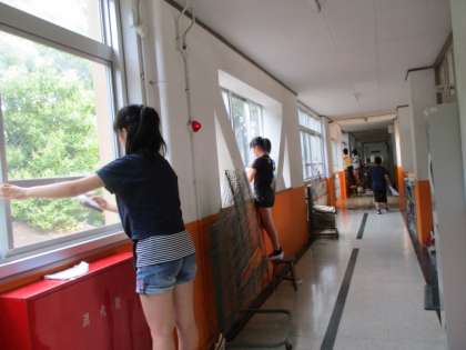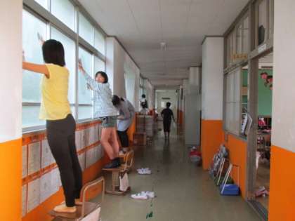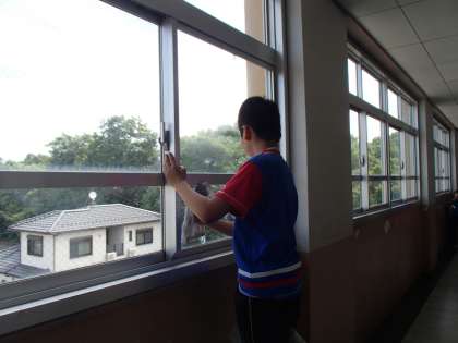 廊下を雑巾がけした後,窓を拭きました。最初は,濡れ雑巾で窓の汚れをとり,その後,新聞紙でみがいて仕上げをしました。新聞紙でみがくと,キュキュと音がして,きれいになっていく様子がわかりました。普段は,なかなか手が届かない所まできれいにすることができました。