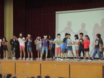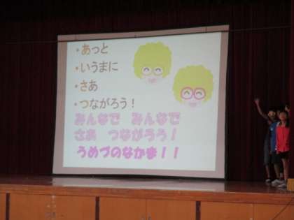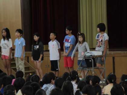 今月の朝会では,各委員長を紹介し,今後も充実した活動ができるように確認し合いました。その後,梅津ワクワクニュース委員会(掲示委員会)が,あいさつ運動の劇を披露し,あいさつの大切さをアピールしました。
