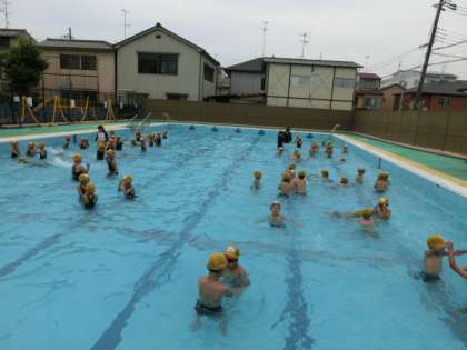 雨で入れない日もありましたが、水泳学習を頑張っています。先週から水の深さが胸ぐらいまでの深さになり、子どもたちはとても喜んでいます。まず、準備体操をすませて、腰あらいやシャワーをしっかりしたあとに、水慣れをします。みんなでプールに入って顔あらいや水のかけあい、ジャンプや水中じゃんけんをしています。その後、もぐったり浮かんだりする活動をして、水の中で体の力を抜くことを覚えます。子どもたちはめあてに向かって楽しみながら学習をしています。