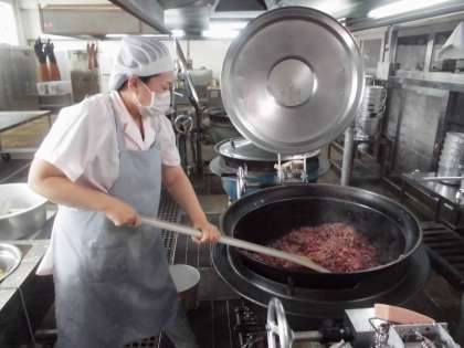 給食室をのぞくと,調理の真っ最中。