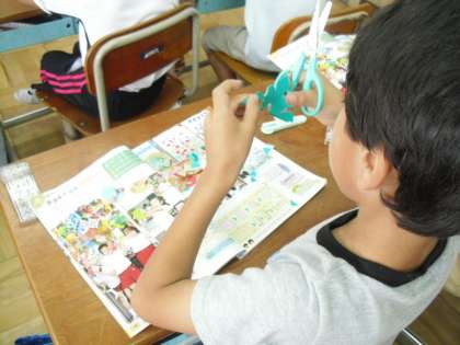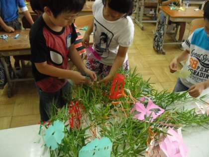 もうすぐ七夕です。梅津小学校では毎年1年生が七夕飾りを作って,教室のドアのところに笹を飾ります。