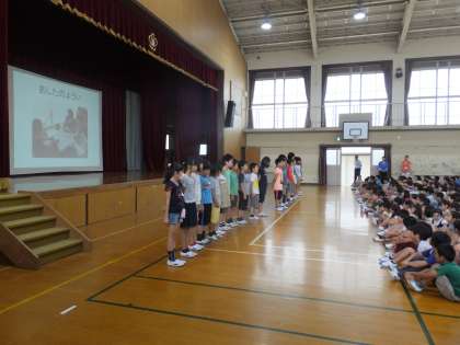 7月4日の朝会で給食委員会より「給食調理員さんの紹介」(5年生)と「給食調理員さんのお仕事」(6年生)を発表しました。