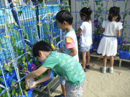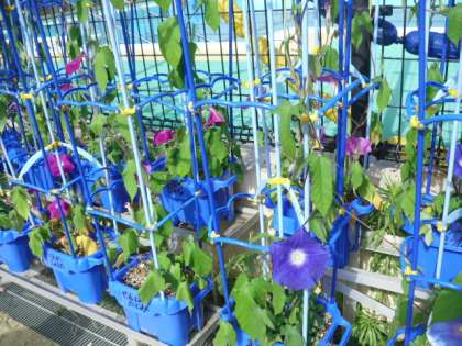毎日一生懸命水をやって育てているアサガオが,たくさんの花を咲かせています。