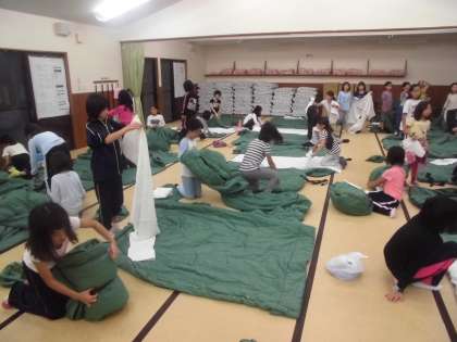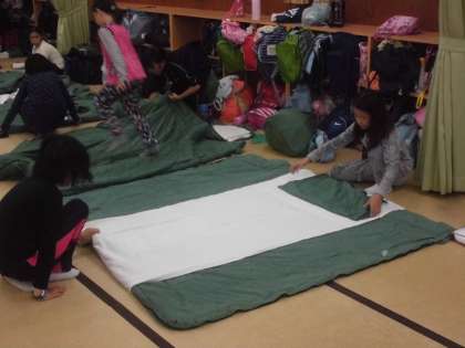 女子は寝袋体験。男子は2段ベッドが目新しいようです。