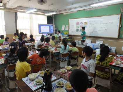 今日は5年生の教室で食の学習を行いました。テーマは「和(なごみ)こんだて」です。和(なごみ)こんだてについて持っているイメージを出しあったり,和(なごみ)こんだての写真から,いつの季節の食材か,どんな行事のこんだてか考えたりしました。