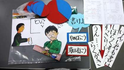 前年度から実施した指導案・板書例・発問・挿絵・吹き出しなどを教材ごとにまとめ,残しています。今年度実施する時に前回のものを参考にしながら,そのまま使用したり,目の前の児童に合わせて作り変えたりしています。また,心の温度計やお面なども残し,今年度につなげられるようにしています。職員室の隅は,宝の山でいっぱいです。
