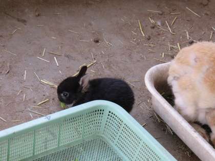 6月14日の朝,3羽のうちのブラックのウサギの赤ちゃんがウサギ小屋を走り回っていました。母親ウサギにと小松菜を与えたところ子ウサギが母親から横取りをして食べていました。産まれて約3週間ですが,食べ物を自分から食べるというのは少し早い気がします。元気に過ごしていますのでこのまま見守って行きたいと思います。