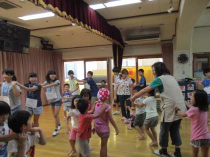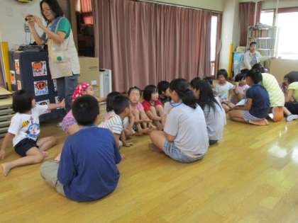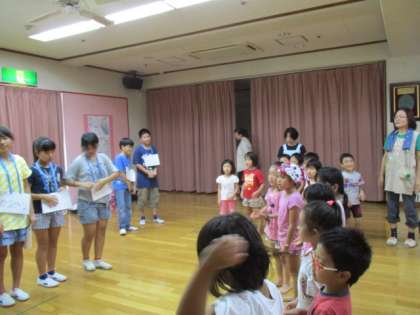 園児さん達に喜んでもらおうと,ゲームを考え,リハーサルをして行きました。元気な園児さん達に「くだものとりに行こうよ」と「貨物列車」のゲームを楽しんでもらうことができました。帰りには,なごりを惜しんでいつまでも見送ってくれました。園児さん達に喜んでもらえたので,みんなの顔が達成感であふれていました。