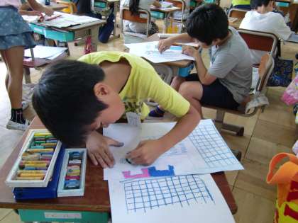 自由度が高い分,難しさはあるのですが,さすが子どもたち!画用紙の折り方を工夫し,アイデアを形にしていきます。その構図の斬新さに感心するばかりです。コンテで下書きをしたり,サインペンを使い線描きをしたり,絵の具を使ったり,クレパスを使ったり,今まで習った技法を総動員して描いています。どんな作品になるのか楽しみです。