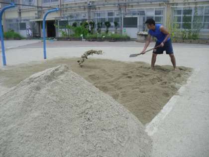 砂場の砂が減って段差があったので,安全に運動ができるように砂の補充をしました。