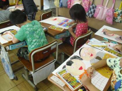 図工科で,おじいちゃん・おばあちゃんの絵を描いています。(写真のご協力ありがとうございました。)