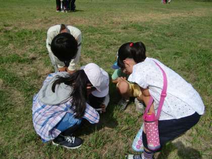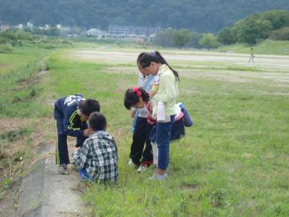 と,子どもたちは,観察の準備をし,桂川の河川敷に向かいました。長そで・長ズボンを着て,りーダーは片手にデジタルカメラを持ち,小さな探検隊に変身です。