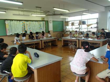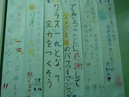 運動会に向けての活動で,学校全体でのスローガンを決めました。代表委員会で,各クラスからでてきたスローガンを見て,どのようなスローガンがいいのかを話し合い,決定しました。