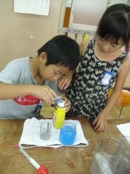 算数科の学習で「おおきさくらべ」を行いました。おうちからもってきた空き容器に実際に水を入れて,どちらがたくさん入るかを調べました。(容器集めのご協力ありがとうございました。)