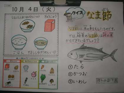 【生節】はかつおを蒸したものです。この生節を炊いた煮汁で厚あげとにんじん・たけのこを煮ふくめました。教室では,食べてみておいしかったからと,おかわりをする児童もいて,「たけのこももうないの?」と残念がる姿も見られました。
