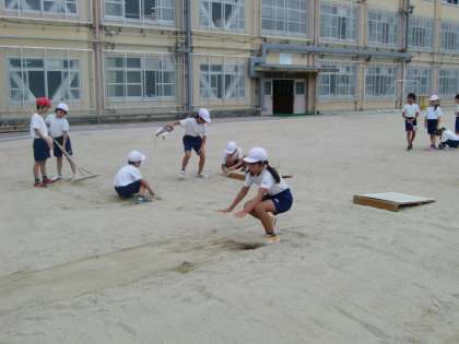 今は,違います。小さな陸上選手たちに成長しました。「助走」「踏みきり」「着地」の一連の流れがスムーズにできています。「助走」のリズムや「踏みきり」のタイミングが体でわかってきています。