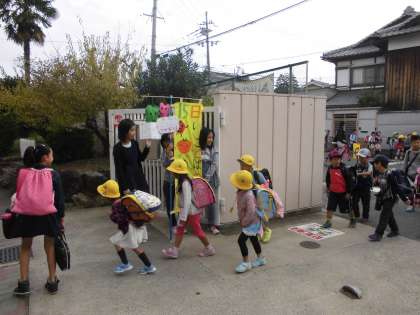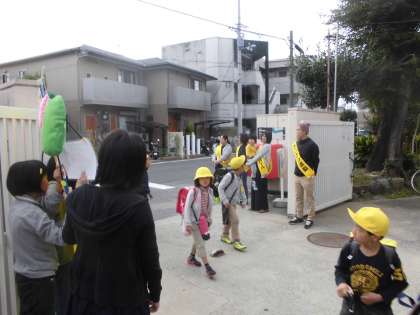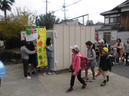 本校では,児童会の子どもたちが,のぼりをもって挨拶運動を行っています。