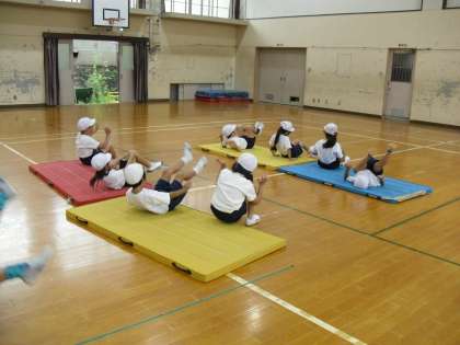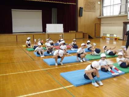 体ならしで,「かえるキック」「ろばキック」をして体をあたため,前転や後転の練習をしています。