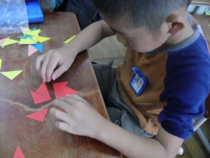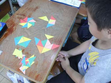 子どもたちは色板の向きや組み合わせ方を考えて,様々なかたちを作ることができました。