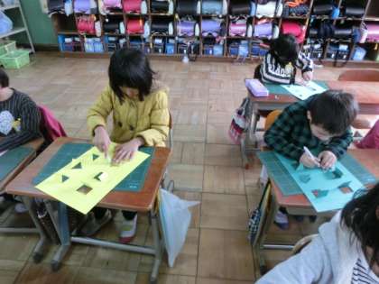 カッターナイフを使うのは少しドキドキしていた子どもたちですが,カッターナイフの向きや手の置く位置を確認して,集中してていねいに活動していました。