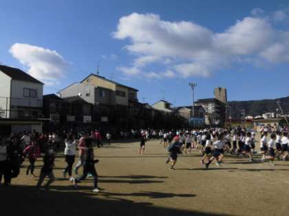 中間休みの5分間,全校児童が運動場でランニングをします。