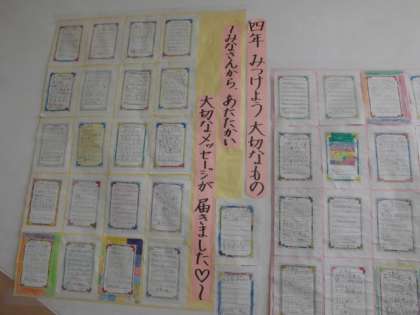 そして,お手紙は全学年廊下に掲示しています。受け取った側も,自分たちでは気付かなかったよさに気付く機会となっています。