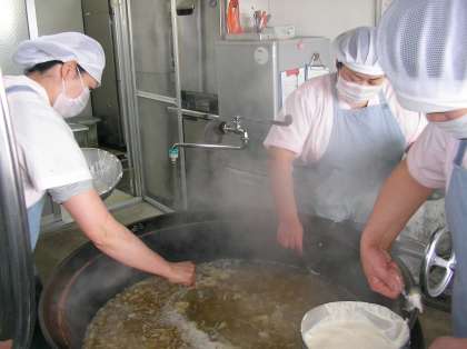 すいとんの生地は,小麦粉と片栗粉をねり,スプーンですくって汁の中に入れていきます。全校約500人分のすいとんを3人で丁寧に入れていくのは手間がかかっています。