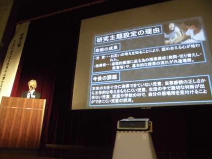 本校は,若松学校長と,齊藤道徳教育推進教師の2名で,一昨年度から研究を進めてきた,学校教育活動全体を通した「道徳教育」の推進と授業改善について,実践発表を行いました。