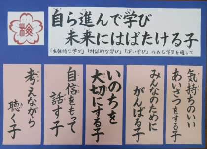 京都市の学校教育の重点である「確かな学力」「豊かな心」「健やかな体」の調和のとれた育成と「自ら学ぶ力」と「自ら律する力」を高める教育を目指すと共に,今年度からは,次期学習指導要領の改訂を意識して,学校教育目標を『自ら進んで学び,未来にはばたける子どもの育成』に,また,目指す子ども像も「いのちを大切にする子」「気持ちのいいあいさつをする子」「考えながら聴く子」「自信をもって話す子」「みんなのためにがんばる子」に変え,教職員が子どもたちと共に「子どもたちが輝く学校づくり」に向けて努力していきたいと考えています。