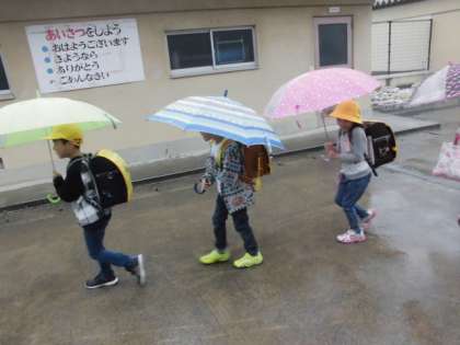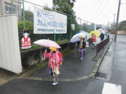 雨の中でしたが,新しい町班長を中心に集団登校です。