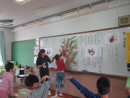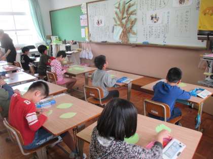 「ことばのまほう」グループでは,学習の最後に,言われてうれしい言葉やこれから使ってみたい言葉を葉っぱに書き,木をうれしい言葉でいっぱいにしました。教室の後ろに掲示しています。