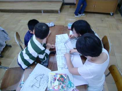 校区の西側を探検して,見つけたものを校区地図にまとめています。班ごとに,大きな地図に{見つけたようカード}を貼り付けています。「夏みかん畑」「茶道教室」等,大人が見落とすようなところもしっかり子どもたちは見つけていました。素晴らしい☆