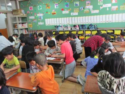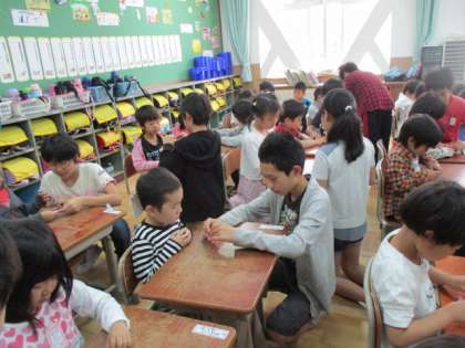 全校でつるを折る取り組みをしました。1年生の教室に6年生が