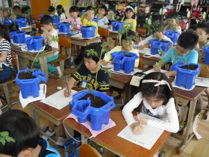 2年生の生活科ではミニトマトを育てます。今日植木鉢に新しい土を入れて,苗を植えました。