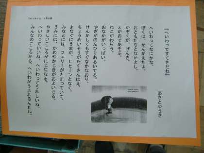 今月の群読の詩は「へいわってすてきだね」です。書写の時間に詩の意味を話し合い,丁寧に視写しました。