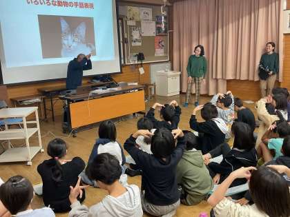今日はその一環として、京都市聴覚障害者協会より聴覚障害の当事者の方と手話通訳者の方にゲストティーチャーとしてお越しいただき、手話についての学習をしました。