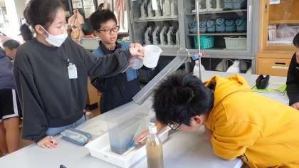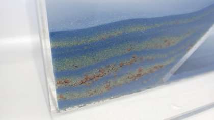 実験によって、きれいな地層ができることがわかりました。さらにくり返し土を流し込むことで、地層が積み重なっていく様子が観察できました。子どもたちは「おお〜っ」と驚きの声を上げていました。