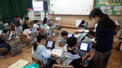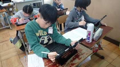 自分が通っていた保育園や幼稚園などのよいところをつたえる文章を書きます。今日は、そのための「組み立てメモ」をつくっています。GIGA端末を使って、いつできたのか、どんな特徴があるのか、何をするところか、などの項目ごとに内容を簡単に整理して書いています。