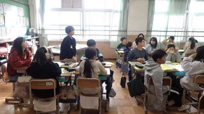 青菜とじゃがいもをゆでてつくる料理について、調理の手順を確かめています。青菜とじゃがいもでは、同じ野菜で調理の手順には違うところがたくさんあります。実習に向けて、みんなで手順や注意点を確かめました。