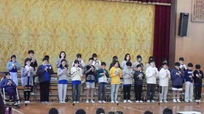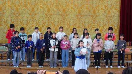 6年生の発表は、学童大音楽会で歌った「U&I」を含む、音楽の発表です。今日は、「翼をください」「U&I」では歌声を、「雨のうた」「海の声」「Under The Sea」「糸」ではリコーダーアンサンブルを、「ラバースコンチェルト」では、合奏を披露しました。
