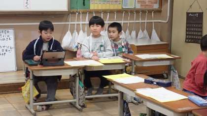 意見を出し合った後は、どの意見に賛成するか、また、その理由は何かを伝え合う活動に取り組みました。全体での交流の前に、ペアで考えを話し合います。その後、全体交流に移りました。会の進行は、司会担当の子どもたちが行います。