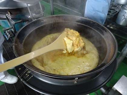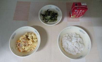 「あげたま煮」は、甘みがたっぷりの油あげとたまねぎ、にんじんと、蒸すように調理したとき卵の献立です。卵が入ることで味がまろやかになり、ごはんにぴったりの献立です。ごはんとあげたま煮を口の中で一緒に味わって、おいしくいただきました