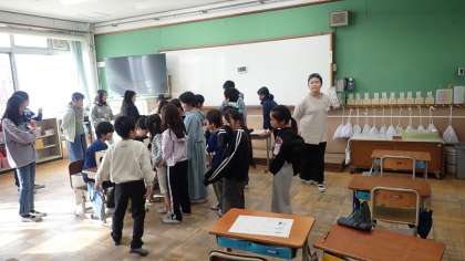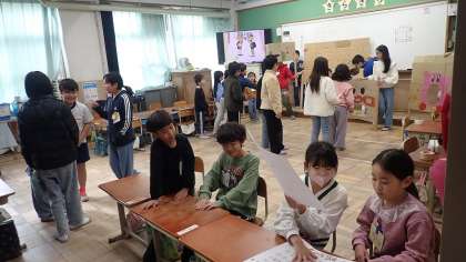 内容は、来週16日に行う「UMEZU祭り」の最終確認とリハーサルです。前半と後半に分かれて店番をするので、交替で店番の仕方を確認しました。お子さんのグループがどんなお店をするのか、ぜひご家庭でも話題にしてください。
