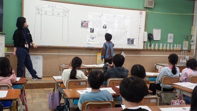 この教材文は、私たちの生活に身近になってきたロボットについて書かれた説明文です。これまでの学習で、説明文は「はじめ」「なか」「おわり」の3つのまとまりで書かれていることを学習してきました。今日は、教材文の「ロボット」がどのように3つに分かれるかについて考えました。