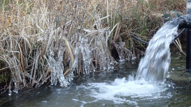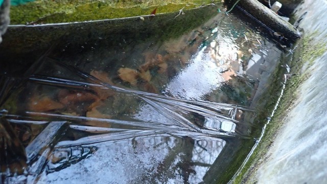 今日も大変寒い朝になりました。雪こそ降りませんでしたが、中庭の池にはうっすらと氷が張っていました。ポンプから出てくる水のしぶきが周りの草に付き、それが凍っている様子も見られました。