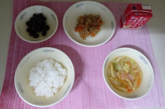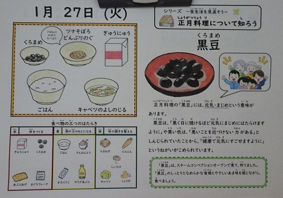 今日は、ごはんに混ぜる献立の中でも子どもたちに人気の「ツナそぼろ丼」でした。甘く味付けされたツナは、ごはんとの相性がぴったりです。しっかりまぜて、ごはんと一緒においしくいただきました。「黒豆」は「元気・まじめ」という意味があり、正月料理としてもいただく料理です。黒豆はスチームコンベクションオーブンで煮てつくっています。しっとりとなめらかな食感と、やさしいあま味を楽しんでおいしくいただきました。