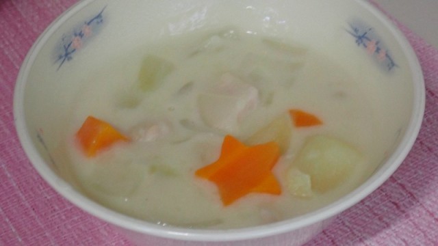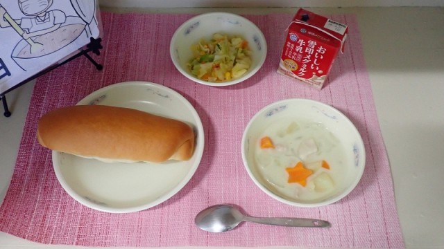 「じゃがいものクリームシチュー」は、ほくほくのじゃがいもがたっぷり入ったクリームシチューです。シチューのルーは、小麦粉をバターでいためた手作りのルーです。今日は、給食週間の取組で各クラスに2つずつ、星型の「ハッピーキャロット」が入っていました。「ハッピーキャロット」があったこは、大喜びしていたそうです。給食調理員さんの手作りのルーのまろやかな味わいを楽しんで、おいしくいただきました。
