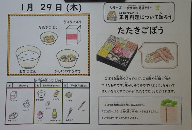 「かしわのすき焼き」は、鶏肉(かしわ)、焼きどうふ、たまねぎ、青ねぎ、糸こんにゃく、切り麩などを使ったすきやきです。たくさんの具材の味を楽しんでおいしくいただきました。「たたきごぼう」は、ごぼうを細長く切ってゆで、ごま酢や甘酢で味をつけたものです。味がしみこみやすいようにたたいて繊維をほぐすことから、「たたきごぼう」と呼ばれます。ごぼうは大地に深く根をはることから、「(ごぼうのように)細く長く幸せに暮らせますように」という願いが込められた正月料理で、色鮮やかなおせち料理に入っています。給食の「たたきごぼう」も、さっぱりした酢の味がとてもおいしかったです。